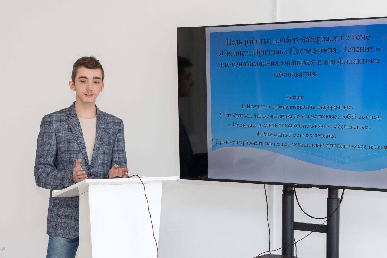 Третье место — у Антона Каменщикова (Школа №51, г. Рязань) с работой «Сколиоз: причины, последствия, лечение».