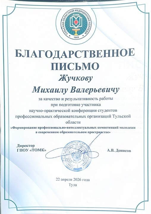 22 апреля 2026 года на базе ГПОУ «Тульский областной медицинский колледж» прошла очная научно-практическая конференция студентов профессиональных образовательных организаций «Формирование профессионально-интеллектуальных компетенций молодежи в современном образовательном пространстве».