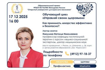 Данный обучающий цикл создан в рамках проекта "Открытый университет для взрослого населения», при организационной и информационной поддержке сообщества "Родные-любимые Рязанской области» Российского движения детей и молодежи «Движение первых». Организатор нового обучающего цикла  для населения - кафедра детских болезней с курсом госпитальной педиатрии. Следующее занятие состоится в субботу, 18 октября, по адресу: г. Рязань, Ул Соборная, д. 8.